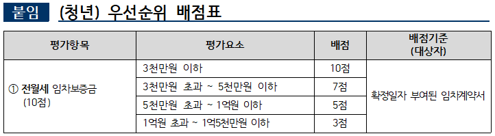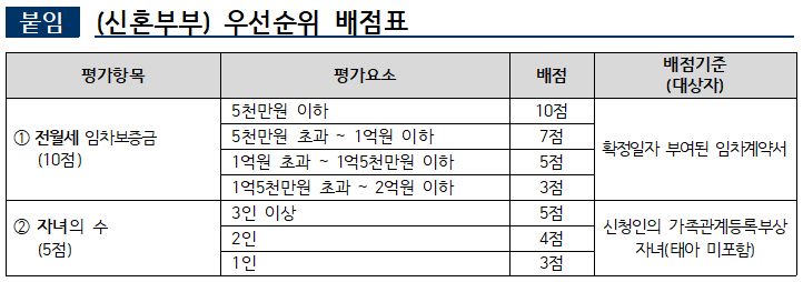 동점자의 경우 신혼부부는 ①임차보증금이 낮은 순 → ②자녀의 수 많은 순(태아 미포함) → ③혼인신고일이 오래된 순으로 선정합니다. 청년의 경우 ①임차보증금이 낮은 순 → ②신청인의 소득금액증명원이 적은 순으로 선정합니다.