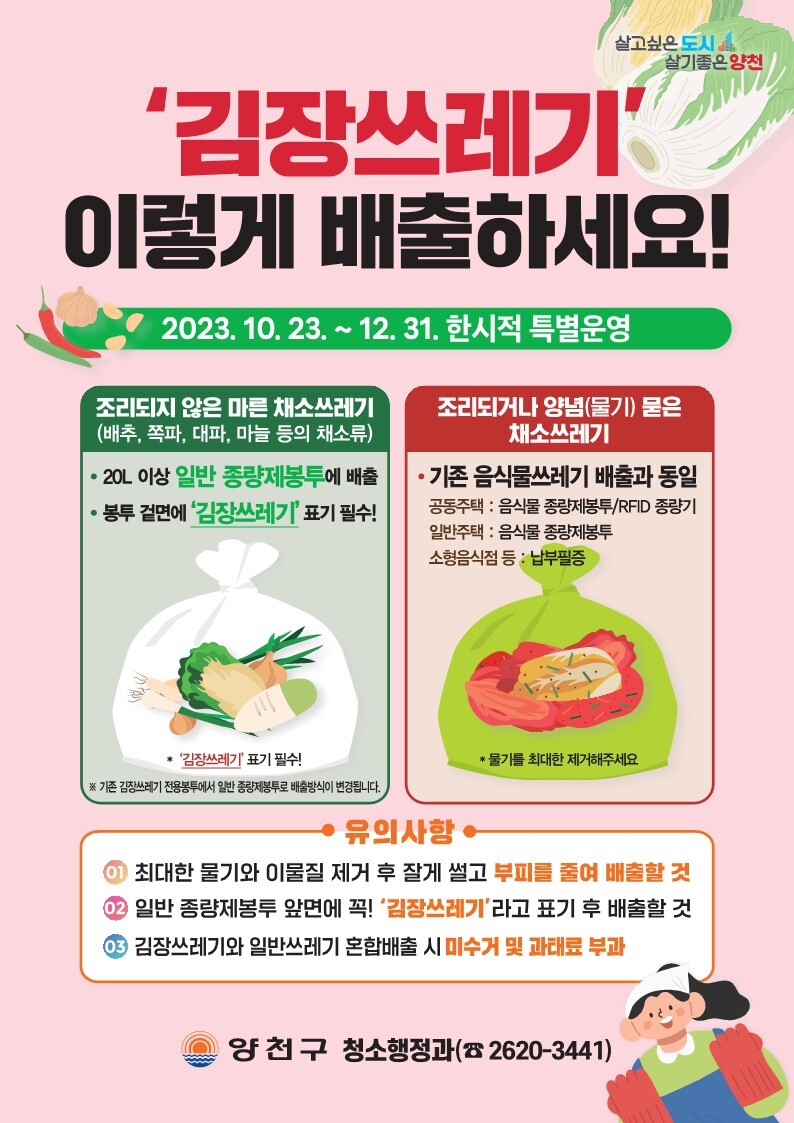 💢이 때 생활쓰레기랑 섞으면 안 되고 꼭 김장쓰레기만 담아서 배출해야 합니다. 안그러면 과태료 대상이에요!