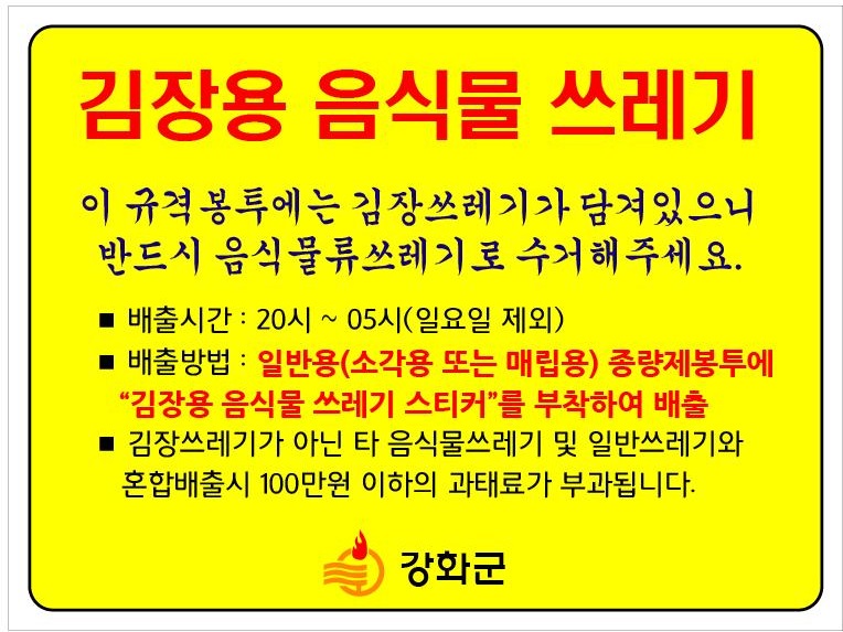 배추, 절임배추, 무, 무껍질, 무청 등은 음식물쓰레기에 해당하는데요, 음식물쓰레기봉투에 담기에는 양이 많은 경우 일반종량제봉투에 '김장쓰레기'라고 반드시 표시하고 배출하면 음식물쓰레기로 인정하고 특별수거해 주는 것입니다.