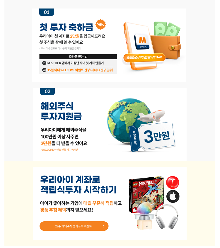 위의 6개의 증권사 중 미래에셋증권, 신한투자증권, 키움닷컴에서 미성년자 주식계좌 개설 이벤트를 진행하고 있습니다. 선착순, 추첨 이벤트뿐만 아니라 참여버튼 클릭만 해도 100% 당첨되는 이벤트도 있으니 상세내용을 확인하신 후 참여하셔서 증권사에서 주는 축하선물 잘 챙기세요!