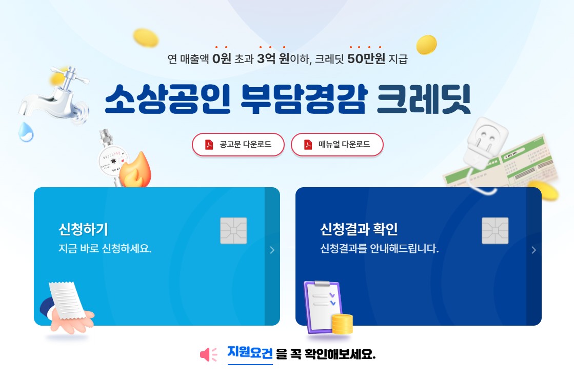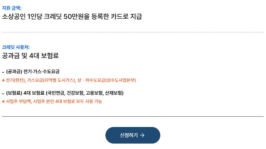 소상공인 부담경감 크레딧 지원 사업은 소상공인 대상으로 공과금, 4대 보험료에 소요되는 비용 일부를 지원하여 고정비용 부담을 경감해 주는 사업입니다.