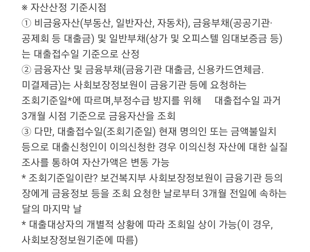 - 자산심사는 '사회보장정보원에서 금융기관에 조회요청한 날로부터 3개월 전'을 조회합니다.