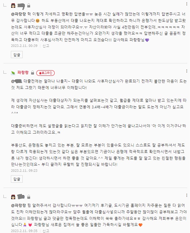 신혼부부 전세자금대출 후기 포스팅을 하며 다음번에 더 잘 진행하기 위한 개인용 기록이기도 했지만 다른 분들에게도 도움이 되어서 정말 보람됐어요. 기프티콘으로 감사의 마음을 전달해 주신 분도 계시고, 답변만 얻고 가시는게 아니라 고맙다고 해주신 분들 덕에 힘을 얻고 개인적인 질문들에 아무런 조건없이 열심히 답변을 달 수 있었어요. 그리고 무엇보다 저도 대출과정 속에서 궁금한 점을 찾아헤매며 도움이 되는 글을 봤을 때의 기쁨을 알기에 적극적으로 도와드리고 싶었어요. 이 포스팅도 또다른 도움이 되길 바랍니다.