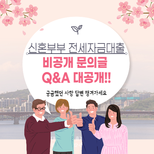 저는 올해 1월에 신혼부부 전세자금대출을 받아서 이사를 했어요. 제 평생 첫 대출이었어요. 새로운 경험이다 보니 저와 같이 헤매게 될 분들에게 도움을 드리고자 상세히 포스팅을 했었고, 도움을 많이 받았다는 댓글과 함께 여러 가지 질문을 받았어요. 대부분 비공개 문의글이어서 비슷한 궁금증을 갖고 계신 다른 분들이 같이 답변을 못 본다는 게 안타깝더라고요. 그래서 이번 포스팅에서 신혼부부 대출 관련해서 공통적으로 궁금해하셨던 내용을 싹 다 정리해서 알려드리겠습니다.