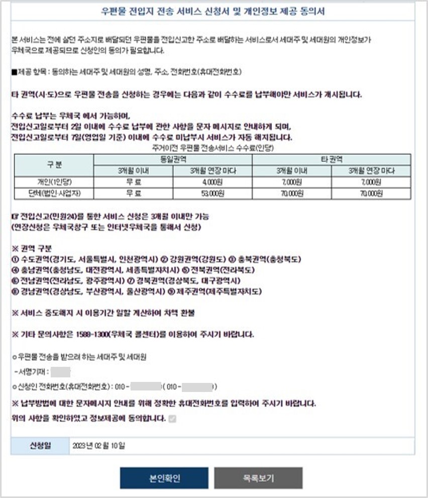 전입신고서 내용이 맞는지 확인하고, 우편물 전입지 전송 서비스를 신청한 사람을 수락할 것인지까지 확인한 후, "본인확인"을 클릭합니다.