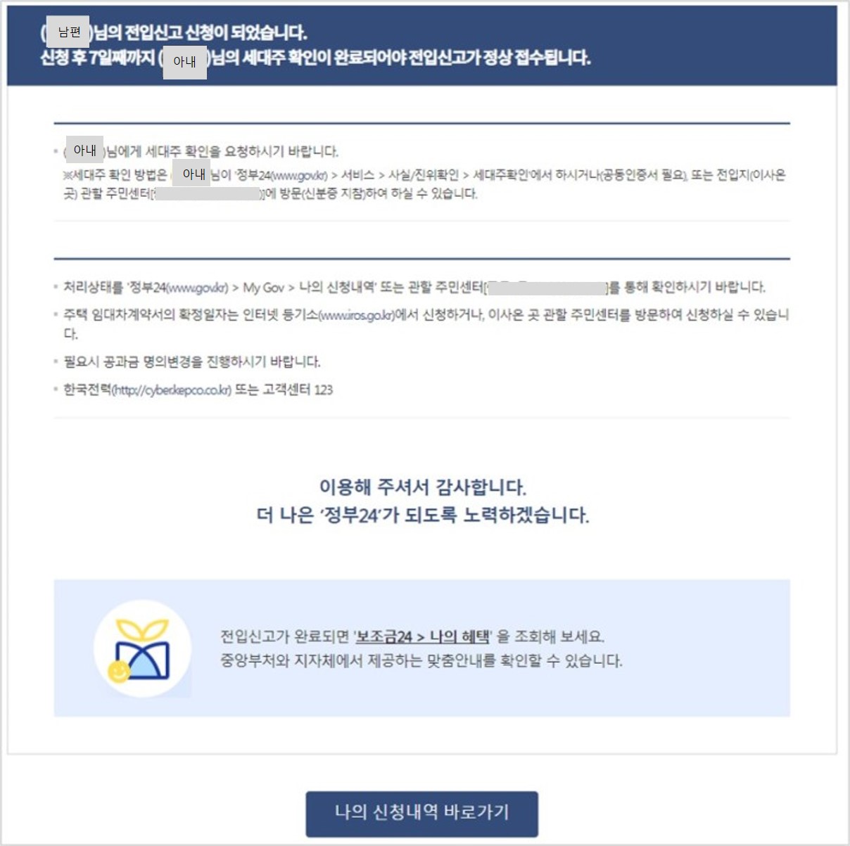 제가 남편보다 먼저 전입신고를 해서 제가 세대주였고, 남편이 나중에 전입신고를 하면서 세대주를 남편으로 변경하고자 했습니다. 그래서 남편이 전입신고 할 때 "이사 온 곳에 기존에 살고 있는 세대주가 있는 경우"를 선택하여 기존 세대주인 저의 정보를 기입했습니다. 신청완료 후 안내 페이지에서 7일 이내 기존 세대주가 세대주 확인을 완료해야 전입신고가 마무리 된다고 써 있었습니다.