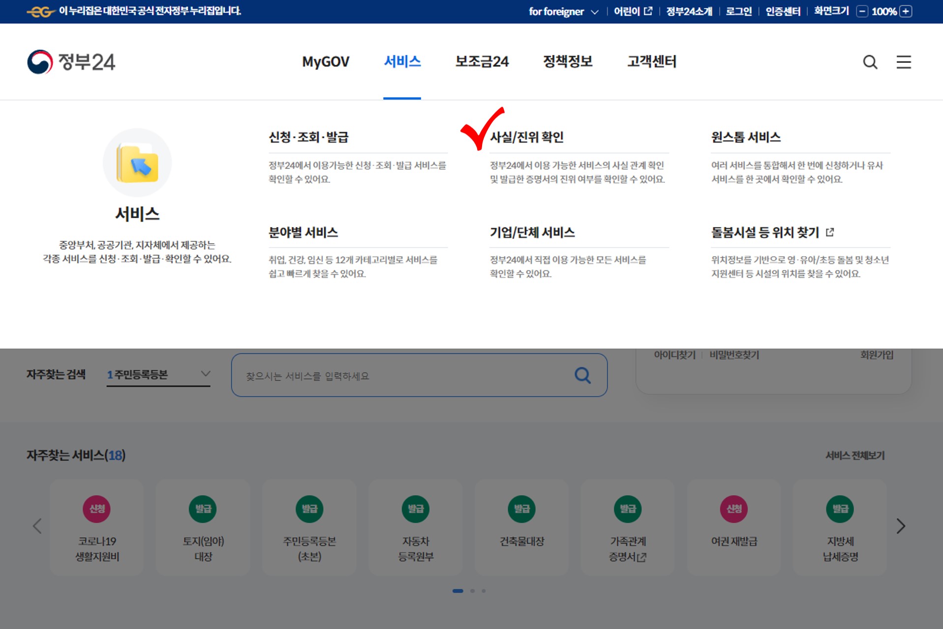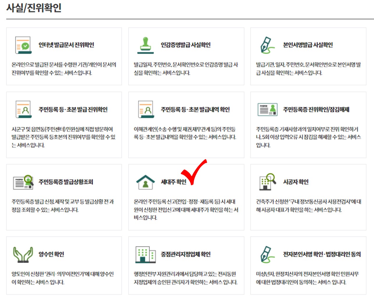 - 세대주 확인 경로 : 서비스 → 사실/진위확인 → 세대주 확인 메뉴