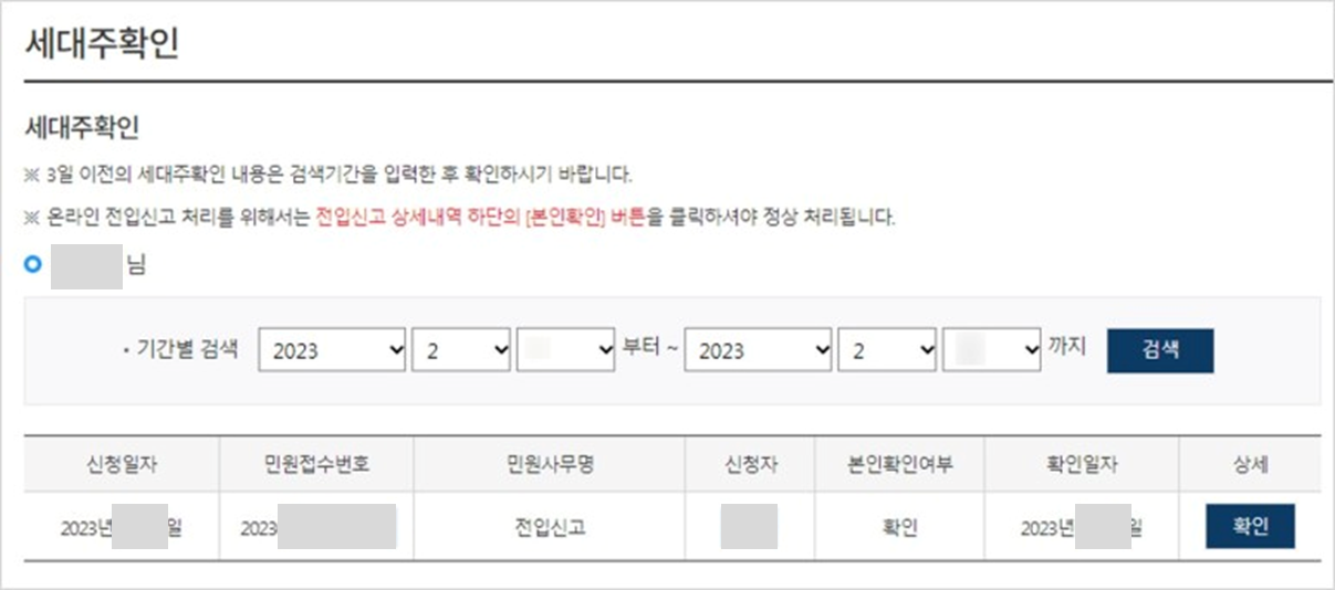 본인확인이 처리되었다는 안내창이 뜨고, 세대주확인 목록에 본인확인여부 항목이 "확인"으로 변경되고, 확인일자가 나온 것을 볼 수 있습니다. 이후 해당 관할 주민센터에서 접수처리를 해주면 전입신고가 완료됩니다. 빠르면 몇 분 내로 완료되고, 근무시간 내 3시간 안에 처리됩니다.