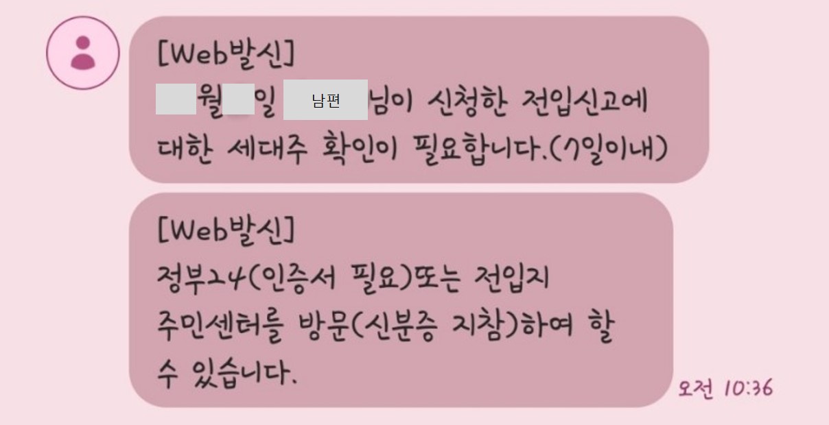 남편이 전입신고를 완료한 후, 바로 저에게 세대주 확인 안내 문자가 왔습니다. 세대주 확인 문자 안내에 따라 정부24에 접속하였습니다.