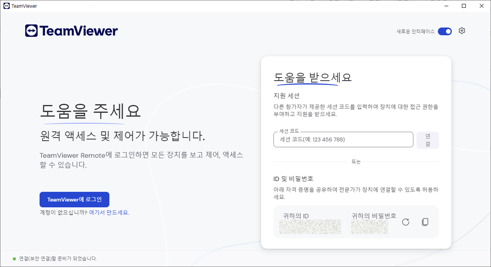※ 원격지원을 받는 기기(또는 사용자)는 팀뷰어에 로그인하지 않아도 됩니다.