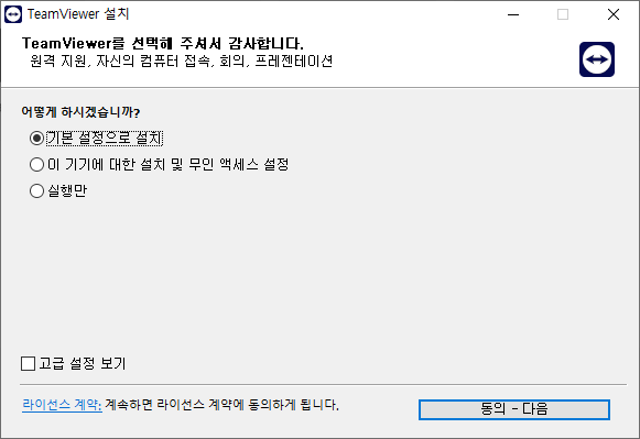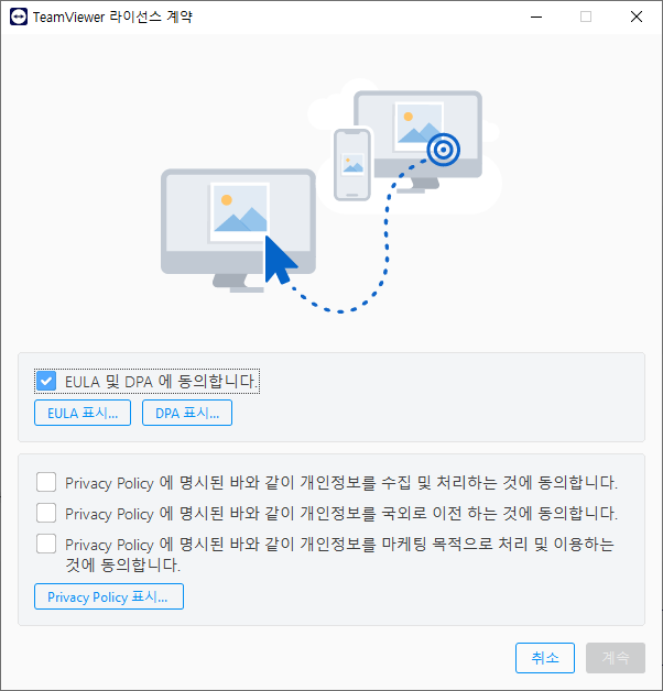 (팀뷰어 라이센스 및 데이터처리에 대해 동의하는 것입니다.)