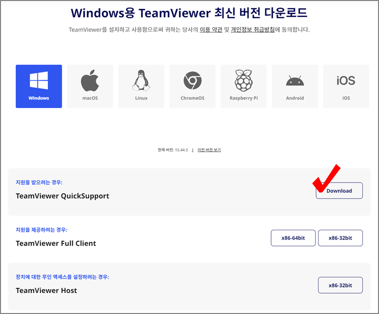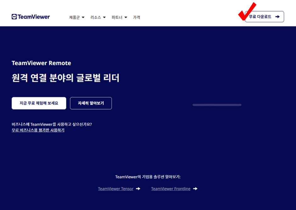 팀뷰어를 다운로드하려면 공식 홈페이지(https://www.teamviewer.com)로 이동합니다. 홈페이지 우측상단에 있는 [무료 다운로드]버튼을 클릭한 후, 한번 더 개인용 [무료 다운로드] 버튼을 클릭하면 됩니다. 아래 링크버튼을 클릭하면 팀뷰어 설치파일을 바로 다운로드 받으실 수 있습니다.