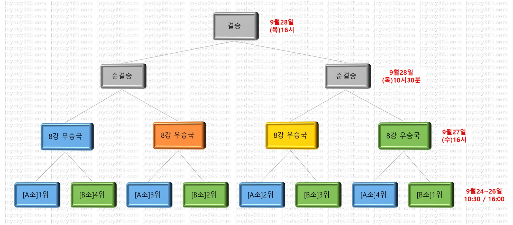 9월 27일(수) | 16:00 | 8강 1경기 : A조 1위 vs B조 4위 2경기 : A조 2위 vs B조 3위 3경기 : A조 3위 vs B조 2위 4경기 : A조 4위 vs B조 1위 |