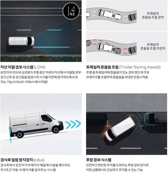 마스터도 전륜 구동 방식을 사용하며, 강력한 트윈 터보 디젤엔진과 뛰어난 주행 안정성을 가지고 있습니다. 유로6기준을 준수하는 트윈 터보 디젤엔진은 최대 출력 150마력, 최대 토크 39.3kg.m을 발휘할 수 있으며, 복합연비는 11km/l(밴 S기준)입니다. 짐을 많이 실을 수 있어서 많은 캠핑 장비나 짐을 운반하는 데 탁월합니다. 6단 수동 변속기와 에코 모드기능을 통해 연비를 향상시키고 유류비 절감효과를 볼 수 있습니다. 차선 이탈 경보시스템, 트레일러 흔들림 조절, 경사로 밀림 방지장치, 후방 경보 시스템, 와이드 뷰 미러 등의 다양한 주행보조 시스템도 있습니다.