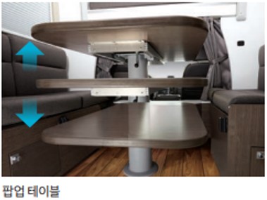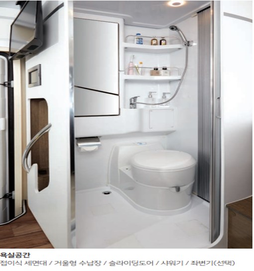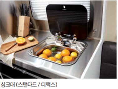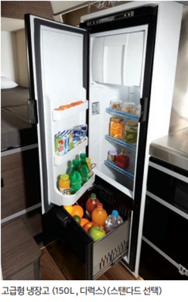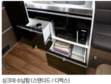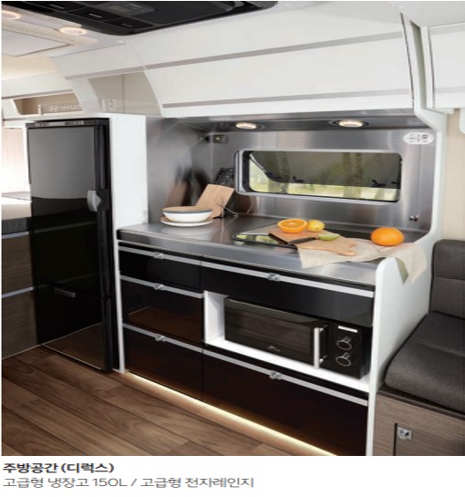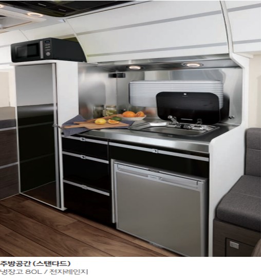 스탠디드 캠핑카에는 냉장고 80L와 전자레인지, 디럭스 캠핑카에는 고급형 냉장고 150L와 고급형 전자레인지가 내장되어 있습니다. 싱크대 등 주방시설과 화장실이 내장되어 있어 캠핑 동안의 조리 및 개인 위생에 편의성을 높혔습니다.