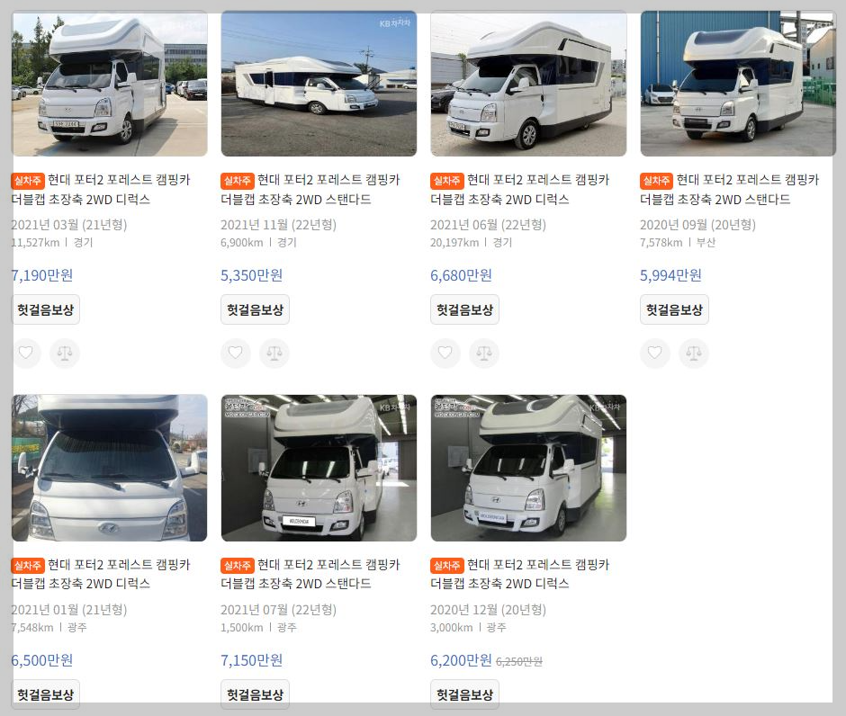 2023년 6월 29일 기준으로 엔카, K카에는 등록된 정보가 없거나 판매가 완료되었습니다. KB차차차에서만 7대의 중고차를 찾을 수 있었습니다. 아래 그림은 검색해서 나온 포레스트 캠핑카 중고차 리스트입니다. 그림을 클릭하시면 KB차차차로 바로 이동하실 수 있습니다.