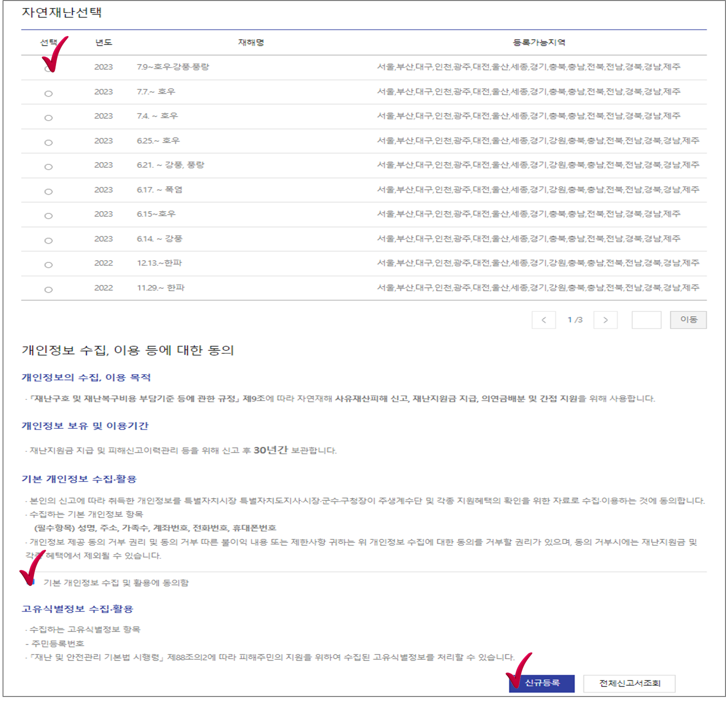 - 등록가능지역을 참고하여 해당 자연재난을 선택합니다.