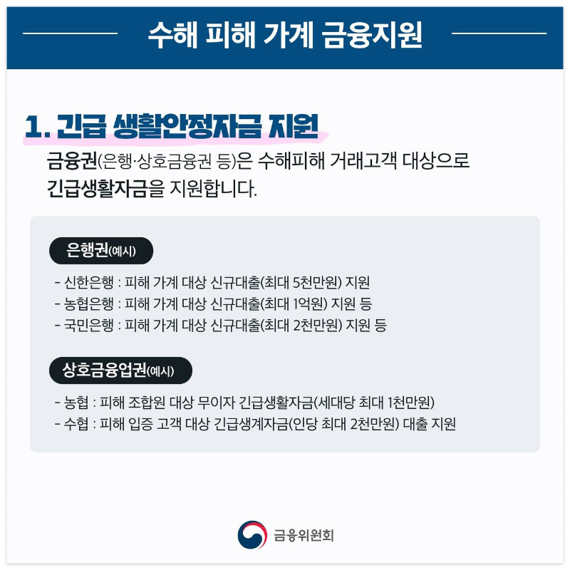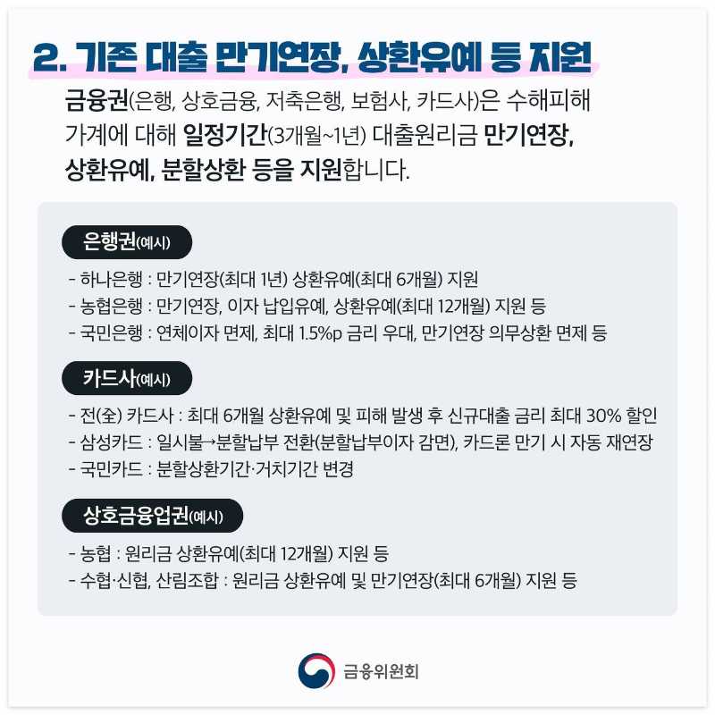 은행, 상호금융, 저축은행, 보험사, 카드사는 장마피해 가계에 대해 일정기간(3개월~1년) 대출원리금 만기연장, 상환유예, 분할상환 등을 지원합니다.