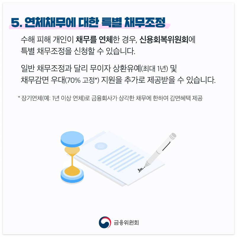 장마 피해 개인이 채무를 연체한 경우, 신용회복위원회에 특별 채무조정을 신청할 수 있습니다. 일반 채무조정과 달리 무이자 상환유예(최대 1년) 및 채무감면 우대(70%고정)지원을 추가로 제공받을 수 있습니다.