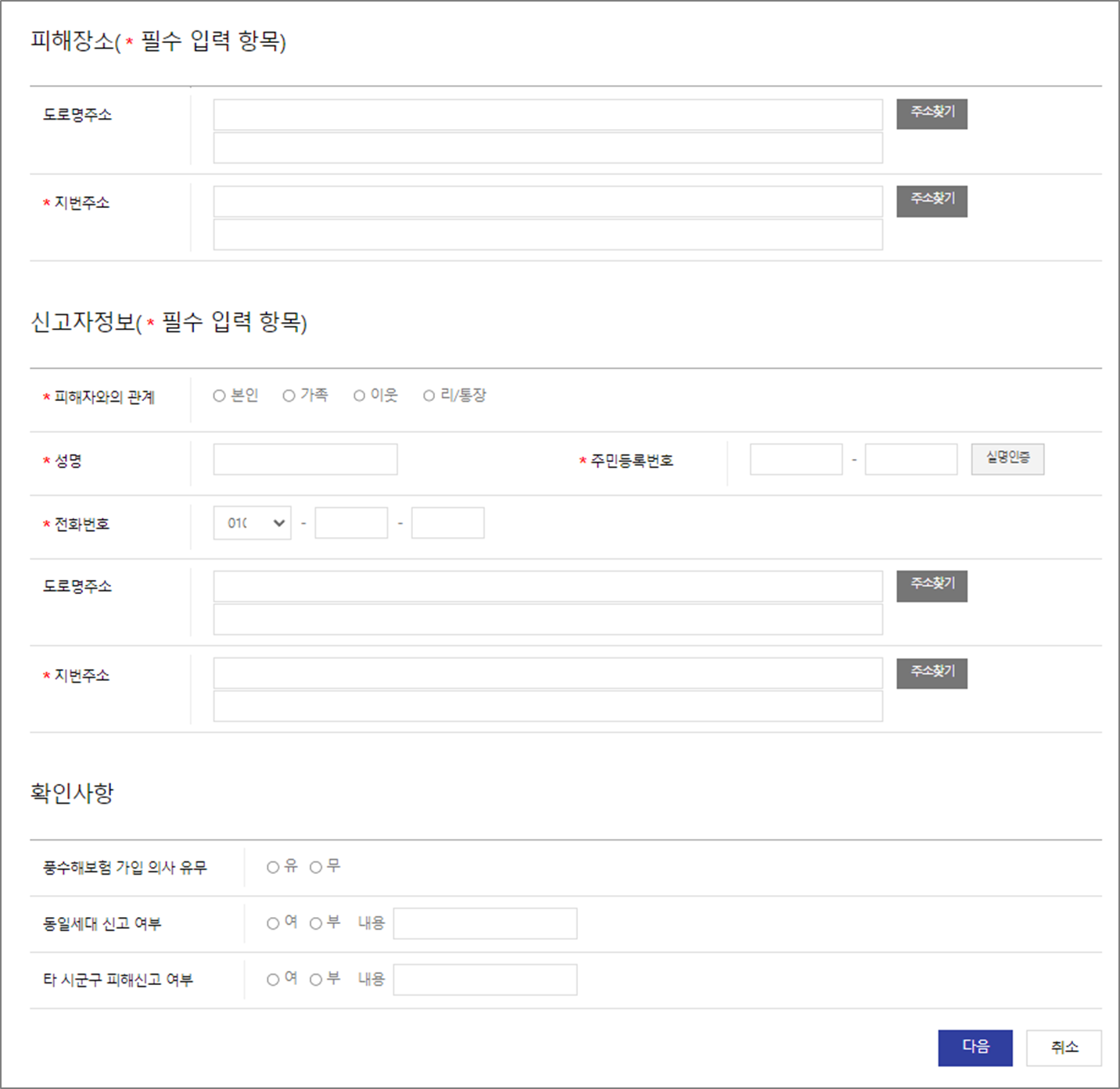 ※ 외국인에 대한 사유재산 피해는 해당지역 주민센터에서 신고하셔야 합니다. - 작성시 문의사항은 해당 시/군/구청으로 문의하시기 바랍니다. >>지역별 비상연락망 바로가기