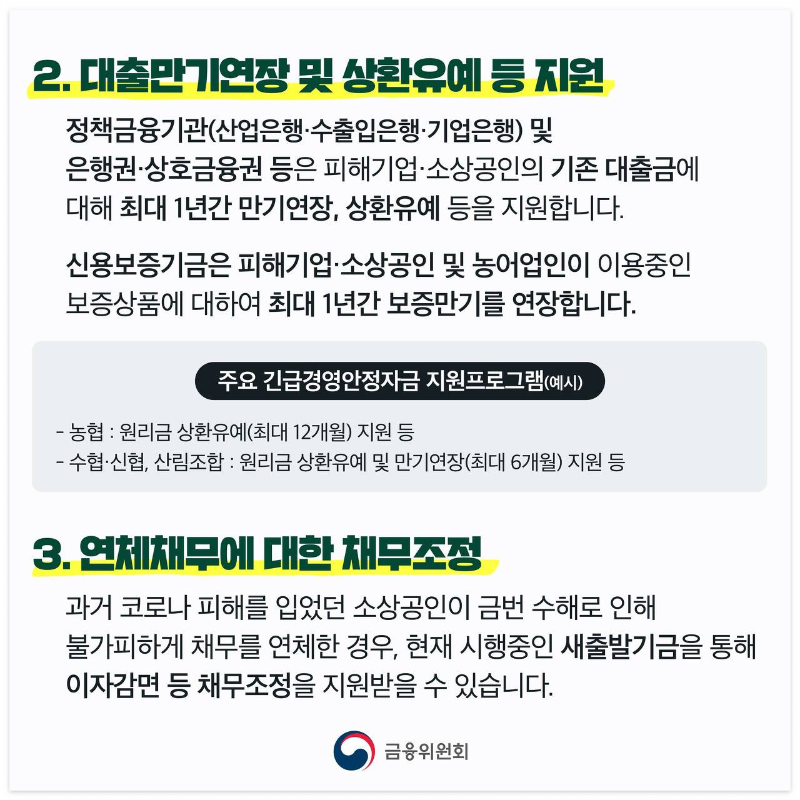 정책금융기관(산업은행/수출입은행/기업은행) 및 은행권/상화금융권 등은 피해기업/소상공인의 기존 대출금에 대해 최대 1년간 만기연장, 상환유예 등을 지원합니다. 신용보증기금은 피해기업/소상공인 및 농어업인이 이용중인 보증상품에 대하여 최대 1년간 보증만기를 연장합니다.