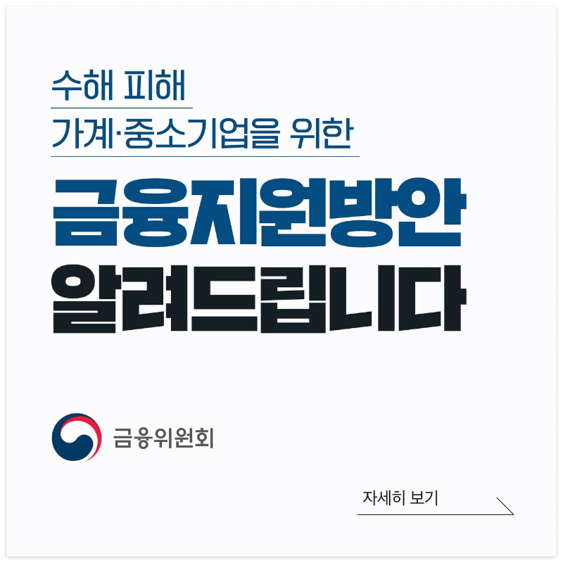 단, 지원대상에 해당하더라도 지원가능여부 및 지원조건 등은 금융회사별로 상이할 수 있으니 먼저 해당 금융회사 또는 업권별 협회 등에 지원내용을 문의하신 후 금융회사 창구를 방문하시기 바랍니다. 또한 금융지원 신청을 위해서는 정부의 특별재난지역 선포 및 지자체가 발급하는 재해피해확인서를 먼저 발급받아 지참하시기 바랍니다.