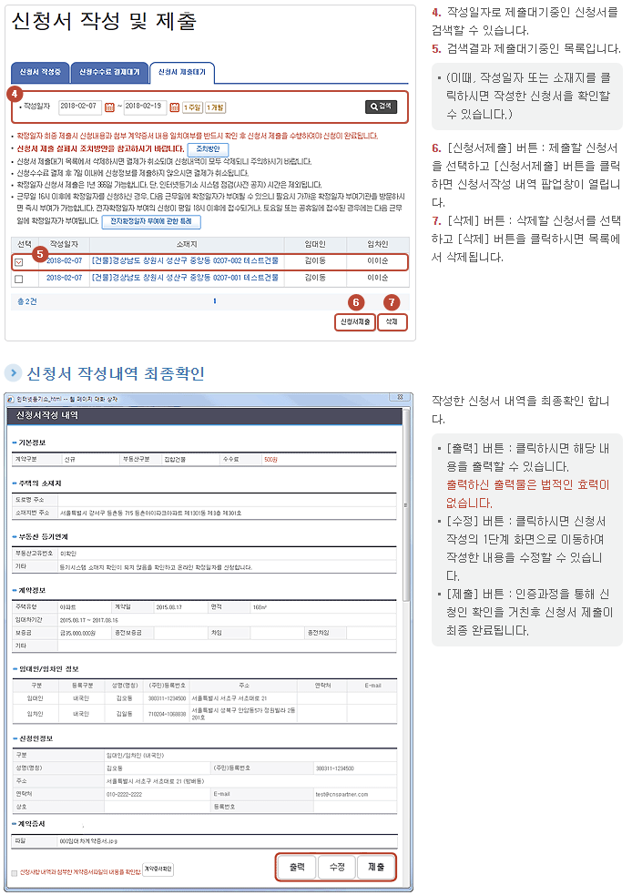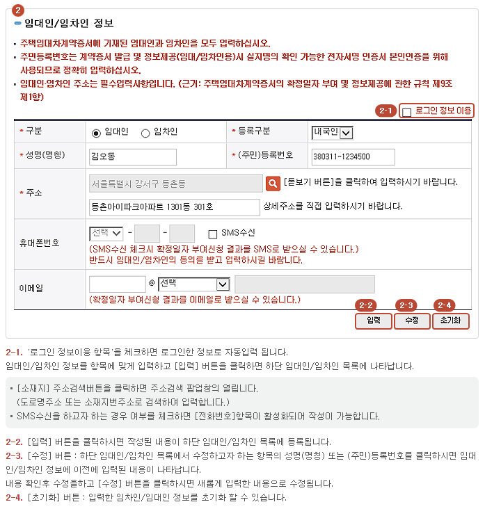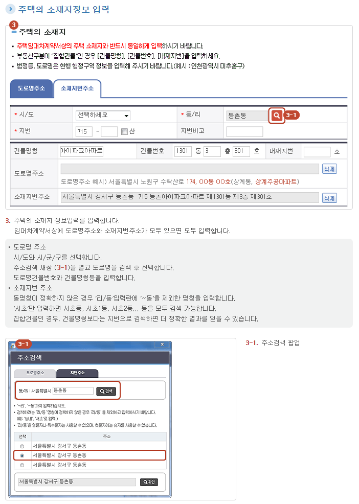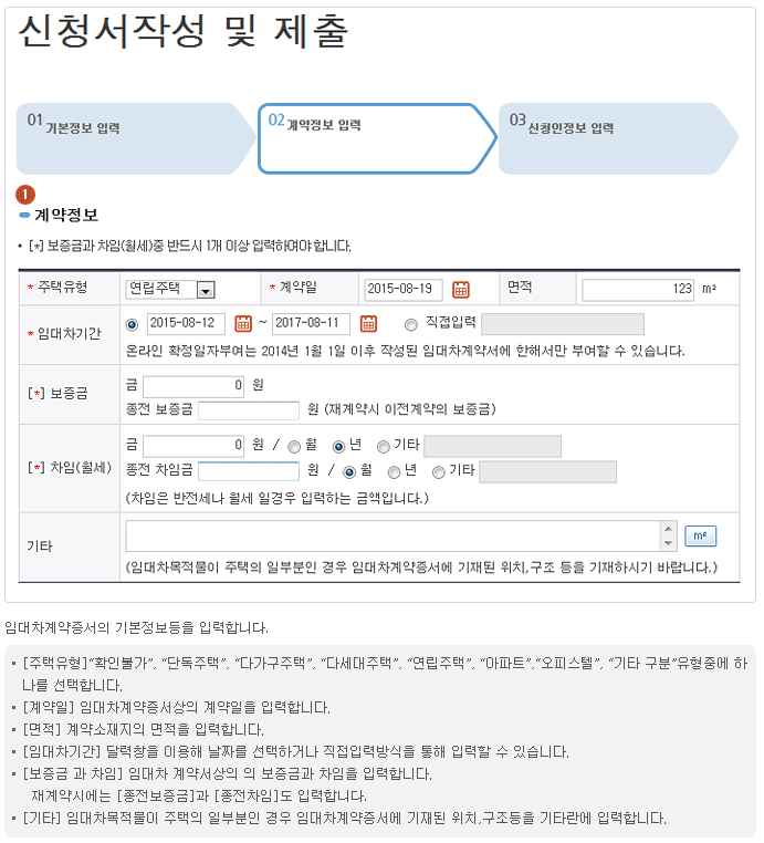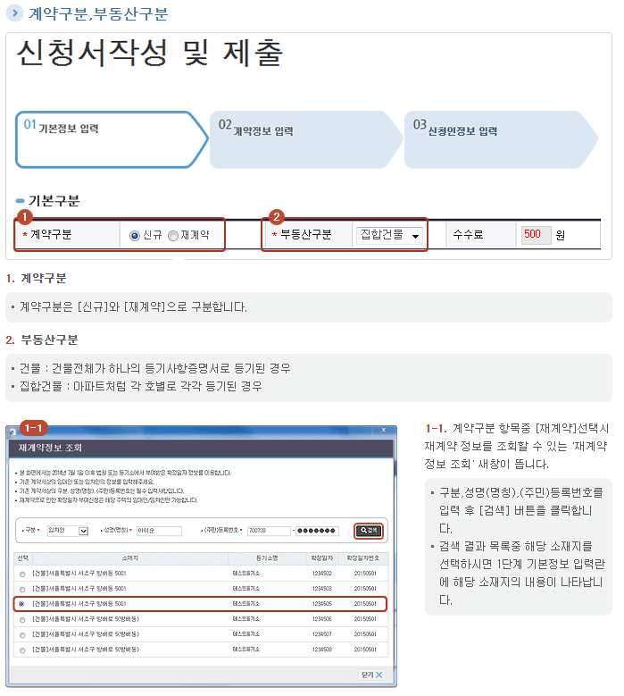 - 기본정보입력 : 계약구분, 주택 소재지, 부동산등기 소재지 등