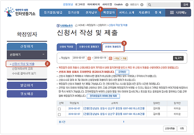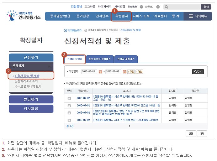 - "확정일자" 메뉴에서 "신청서 작성 및 제출"을 클릭합니다.(해당 화면은 하단에)