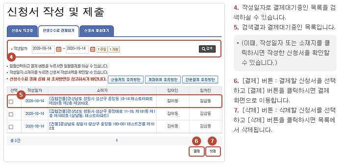 ▼핸드폰으로 계약서 사진 찍은 후 PDF파일로 변환해서 올리는 방법▼ - 신청수수료 전자결제 : '신청수수료 결제대기' 탭에 있는 작성완료된 해당 신청서를 선택하여 결제