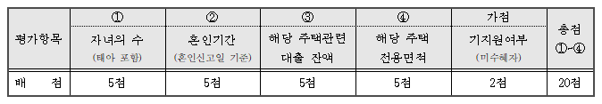 동점자의 경우 평가항목 [①자녀수 → ②혼인기간 → ③대출잔액 → ④전용면적] 순의 최다 득점 순으로 결정됩니다.