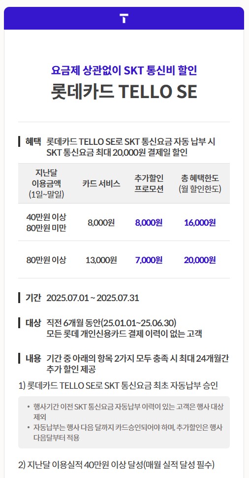 7월 LG 유플러스 제휴카드 중 롯데카드가 추가 할인 프로모션을 진행하고 있습니다.